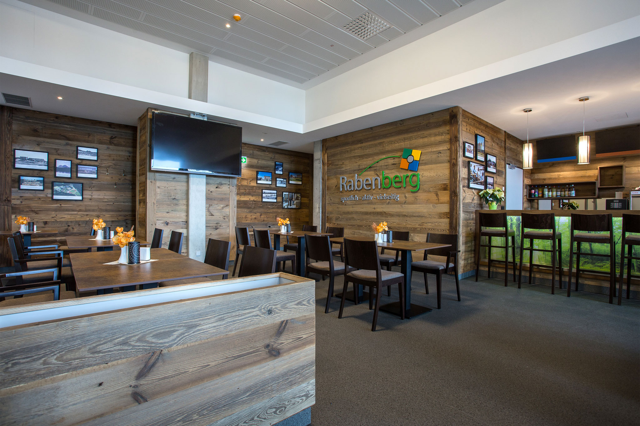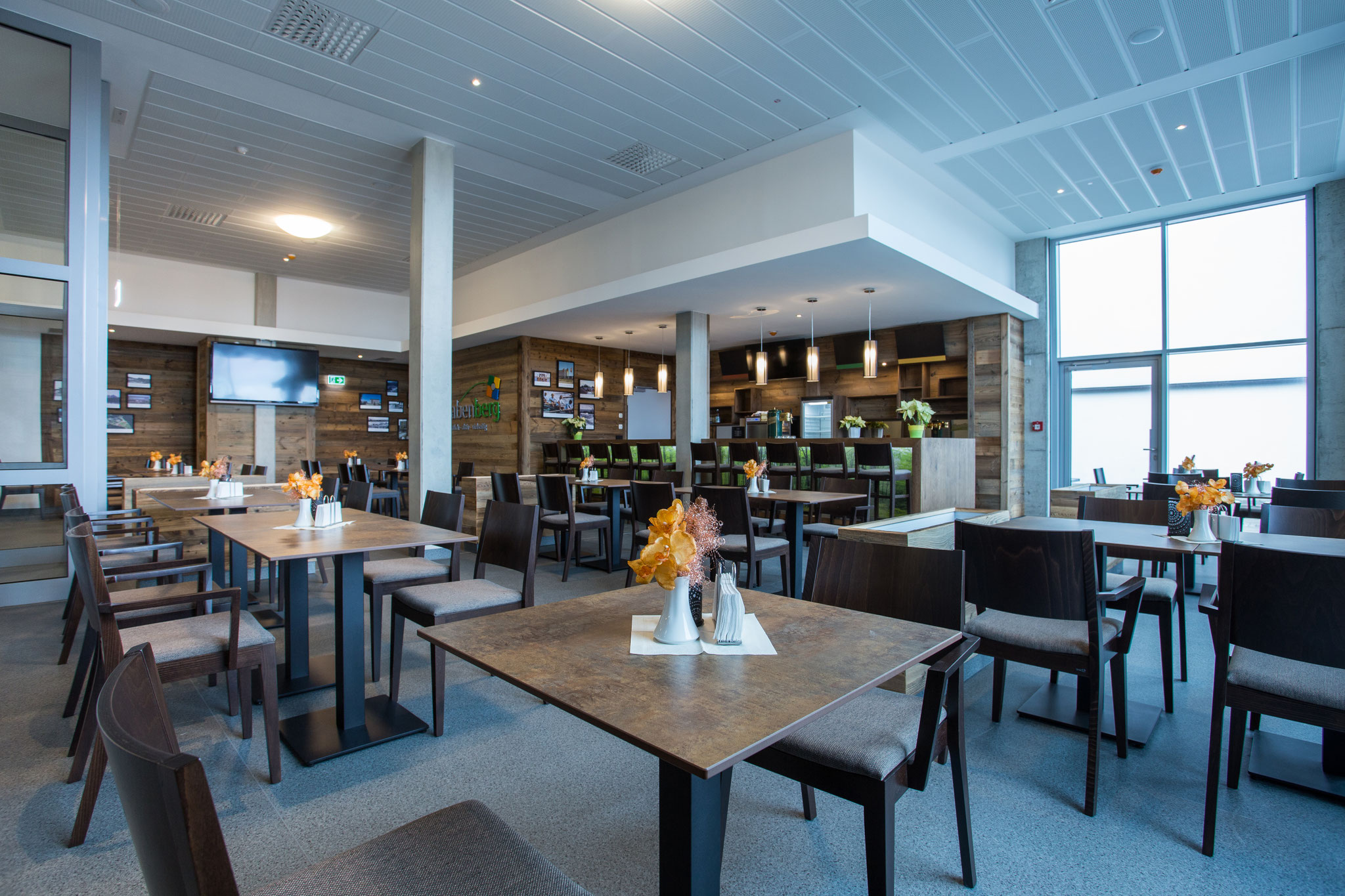 Der Hauptspeiseraum befindet sich im Hauptgebäude und serviert sportlergerechte Mahlzeiten in Buffetform. Für den Abend findet man hier auch Platz zum Entspannen in der Sportbar.