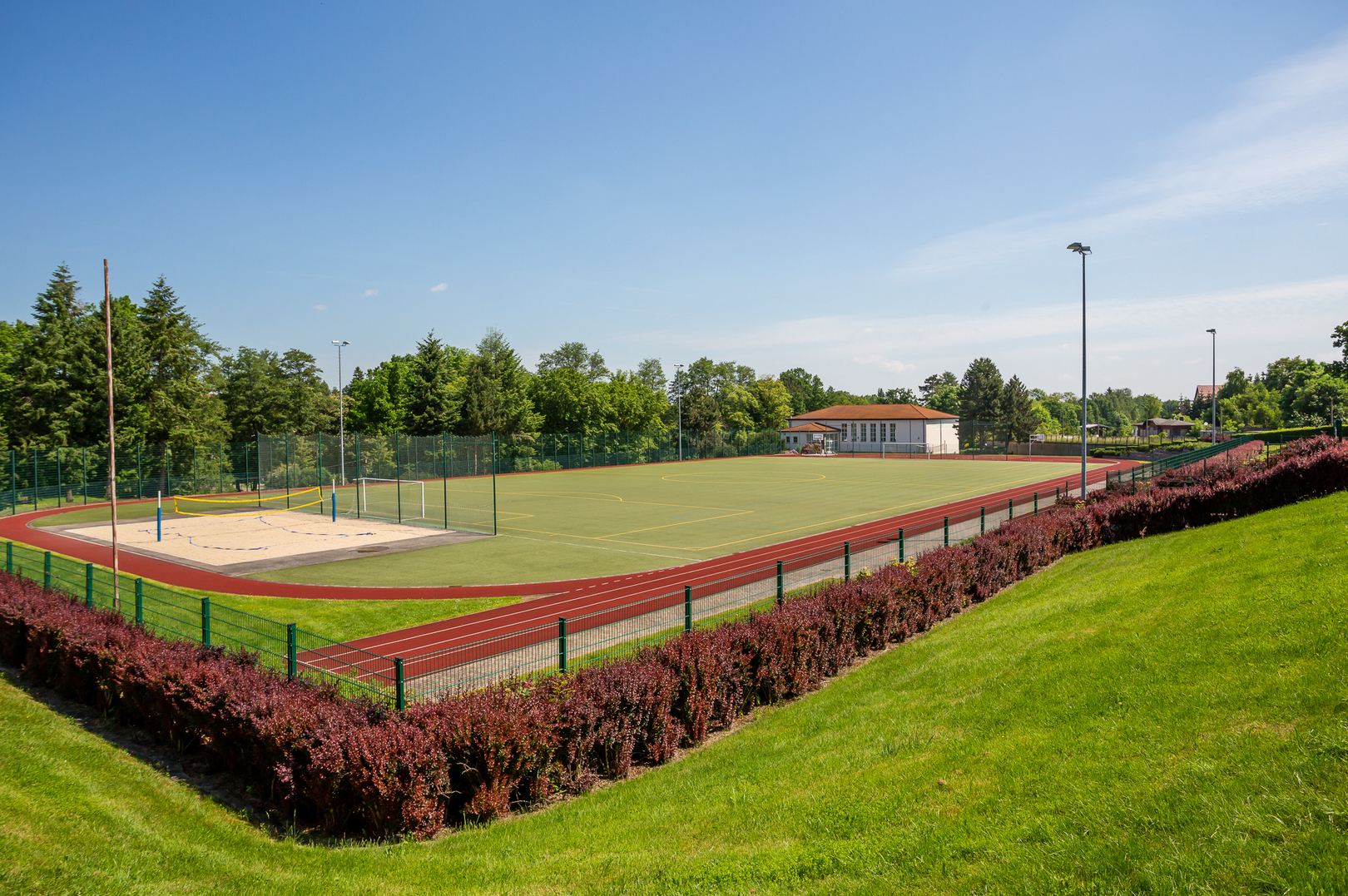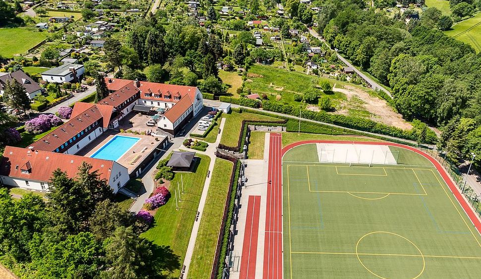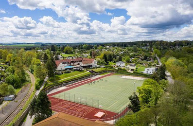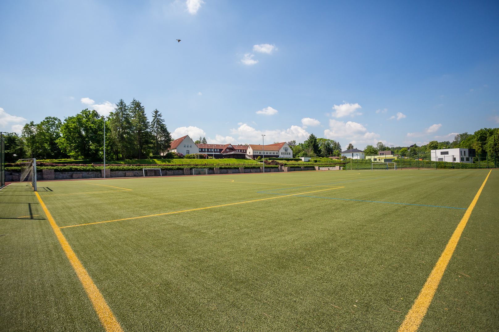 Der hauseigene Kunstrasenplatz hat die Maße 95m x 55 m. Die Flutlichtmasten sorgen auch bei Dämmerung und Dunkelheit für gute Sichtverhältnisse.